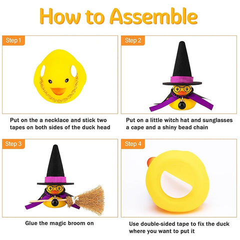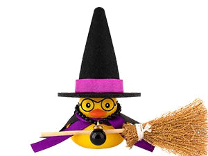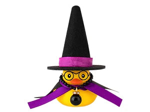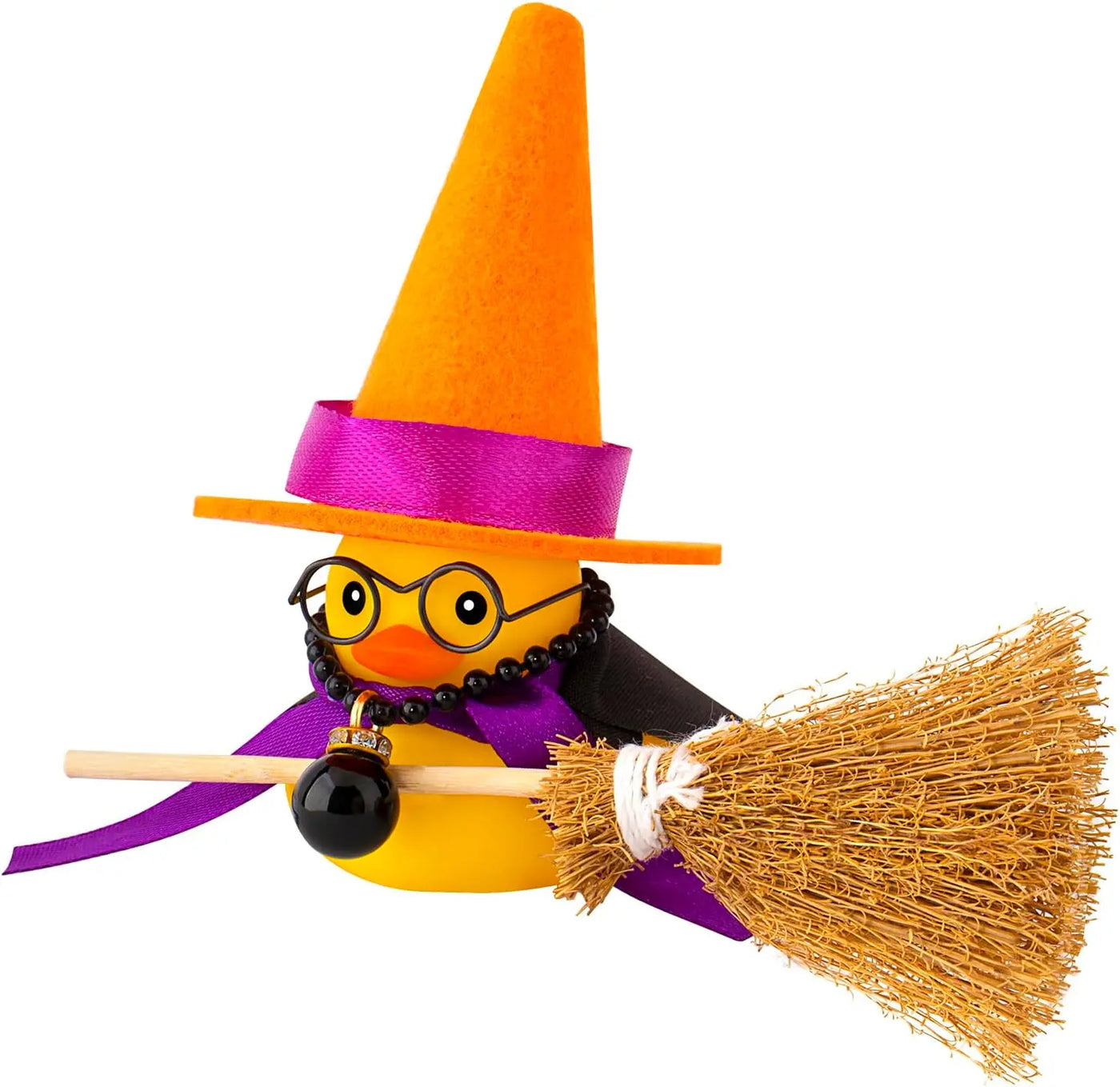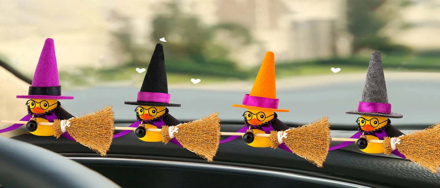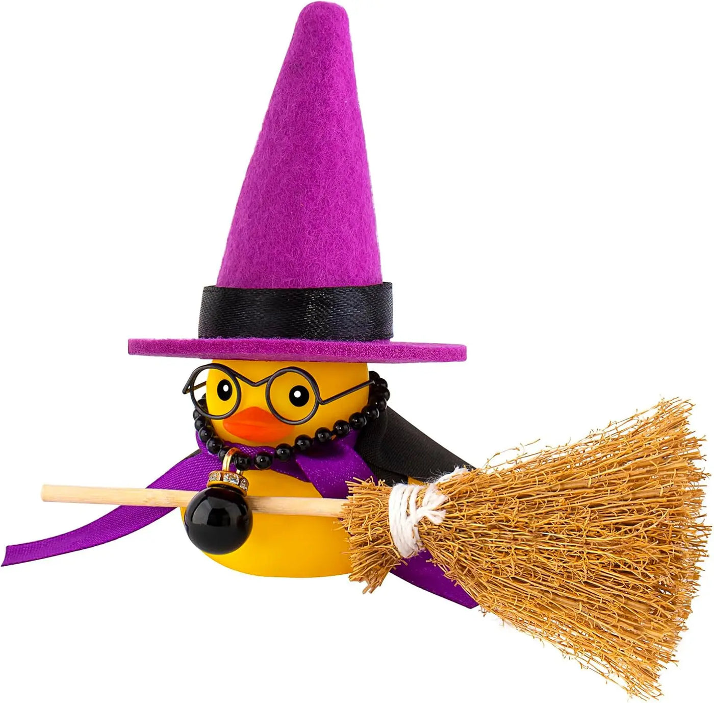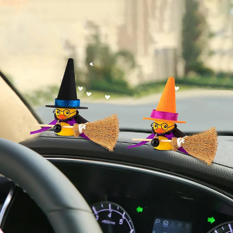 Featuring a charming duck dressed up in a Halloween-themed outfit — complete with a magic hat, broom, necklace, and round sunglasses — this figure brings fun personality and festive flair to your car interior.