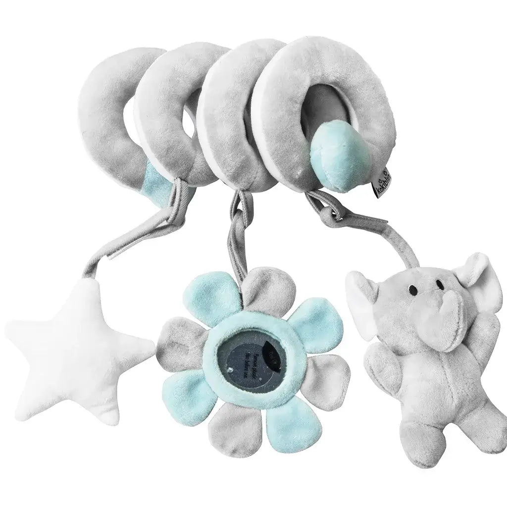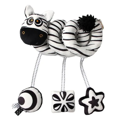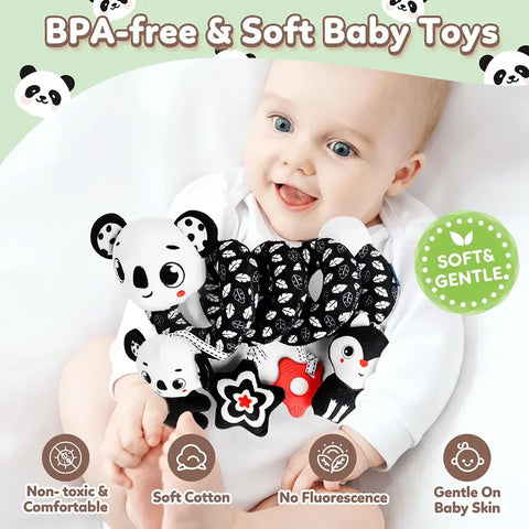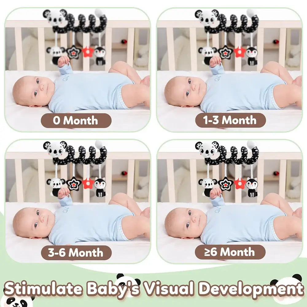 Featuring adorable black & white lion and koala characters, this soft spiral toy easily wraps around crib rails, strollers, or car seat handles, offering fun and comfort during playtime or travel.