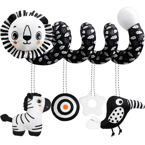 Newborn Spiral Hanging Stroller Toy – Black & White Lion & Koala Rattle Plush Sensory Toy for Car Seat, Crib & Playtime